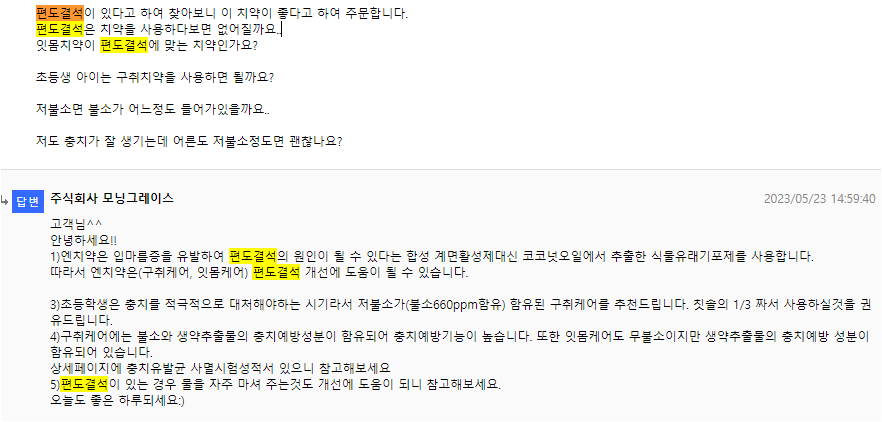 편도결석에 대한 구매자의 질문에 쇼핑몰의 판매자 (제조사로 생각됩니다.)의 답변을 보면
